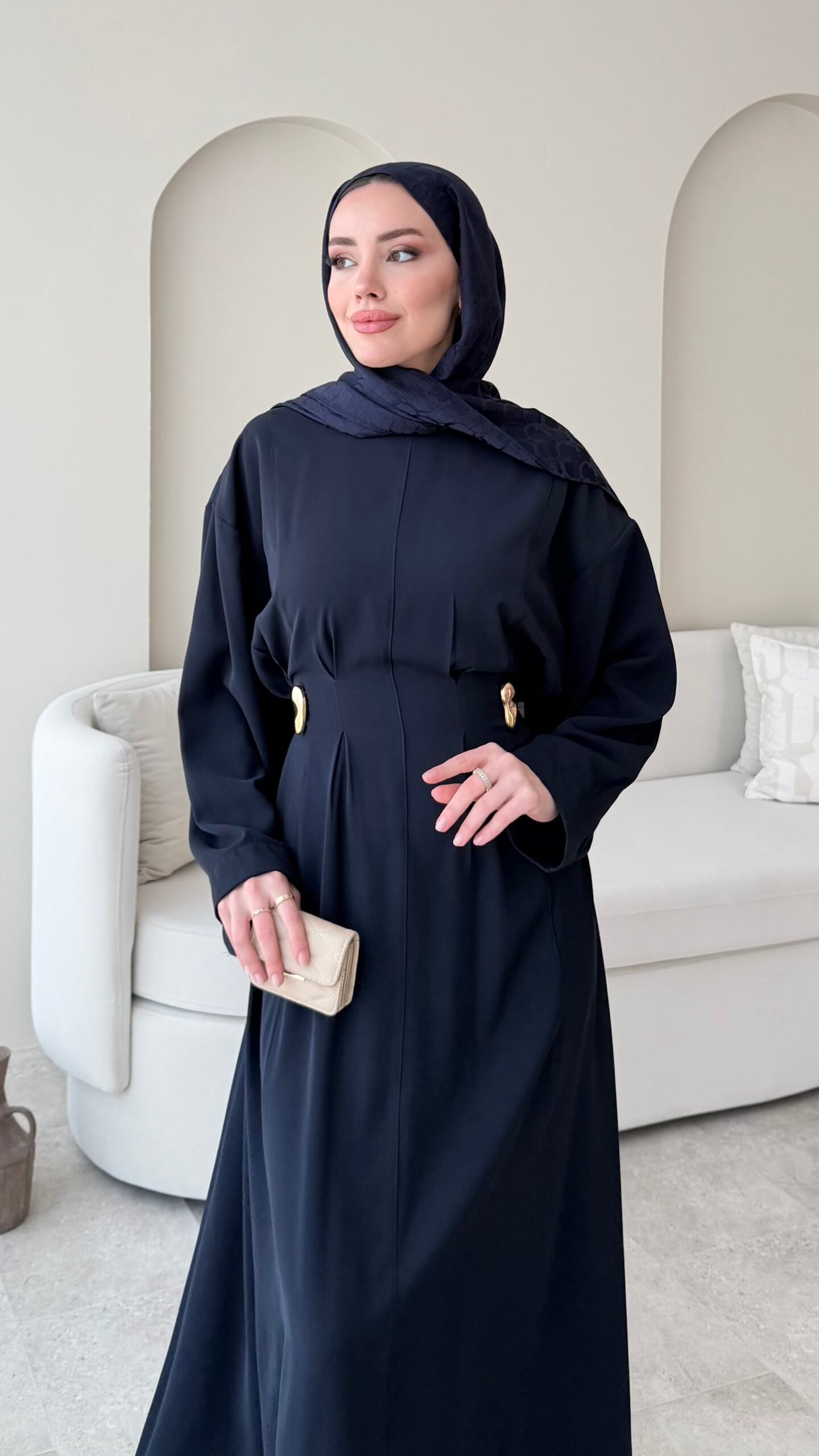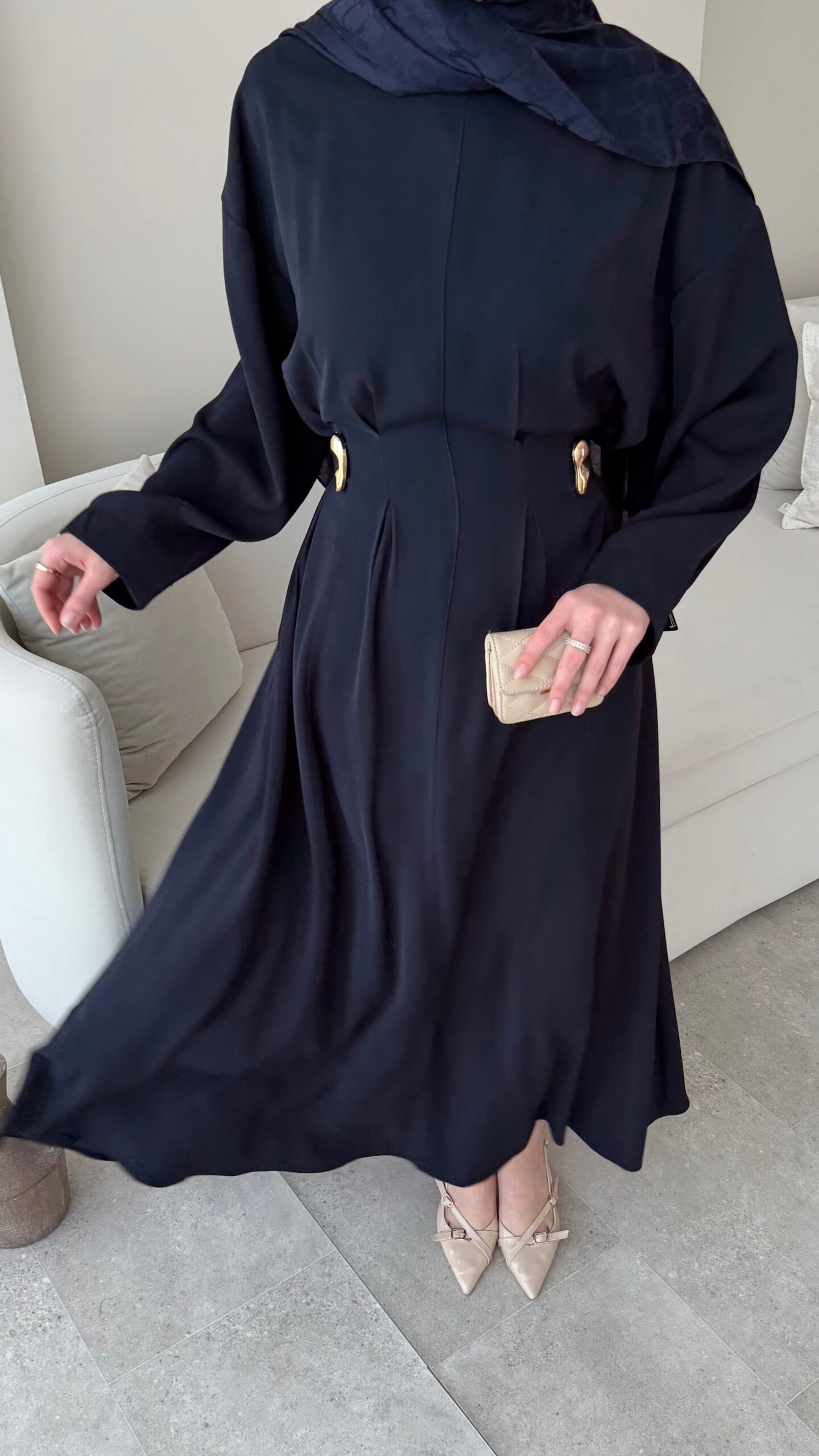 Gold aksesuarlı kuşağıyla belinizi istediğiniz ölçüde daraltıp genişletebilirsiniz.