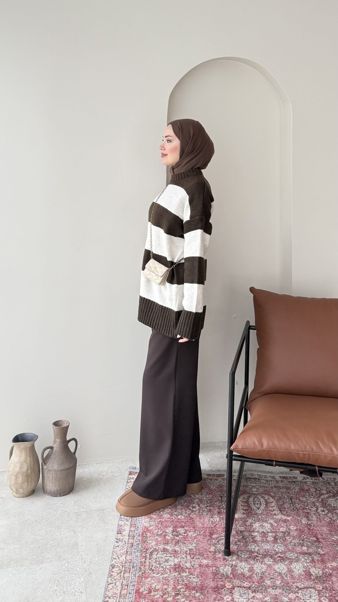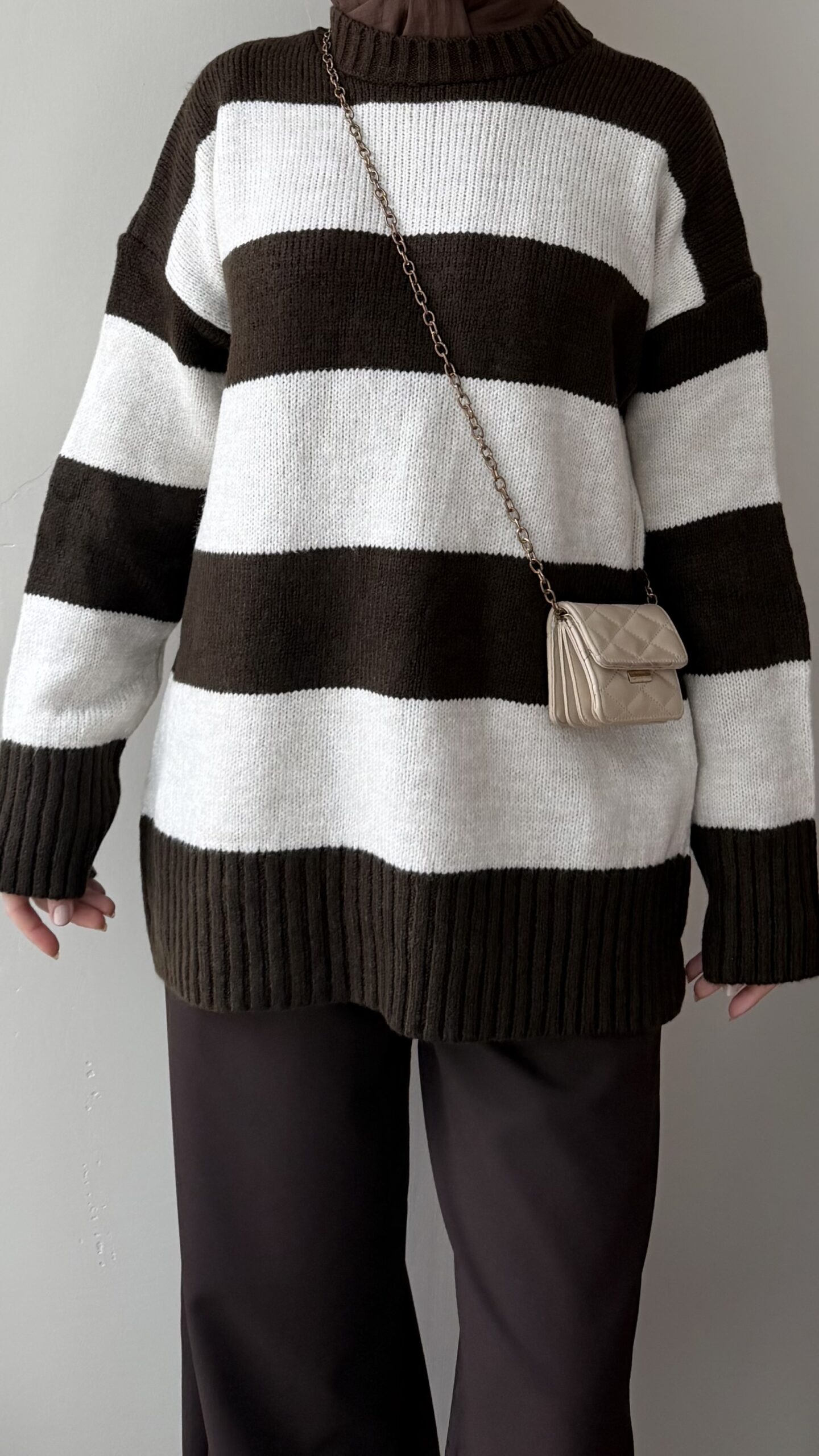 Ella Çizgili Triko Kazak – Kahve