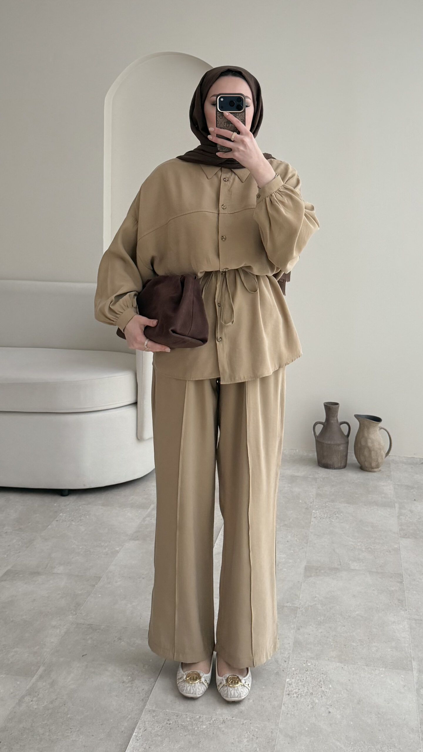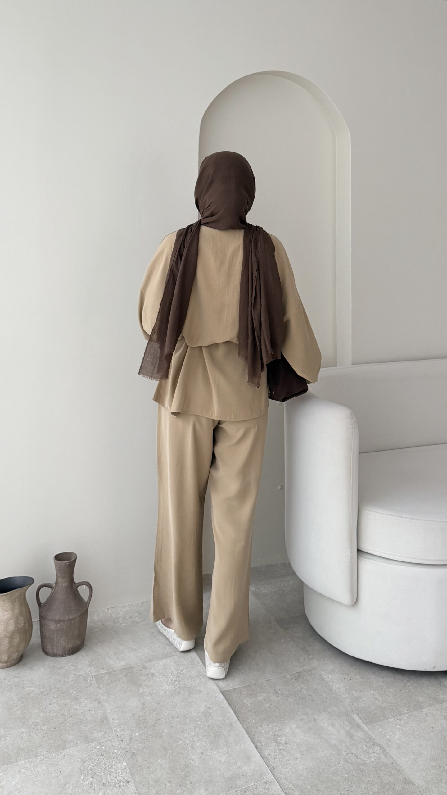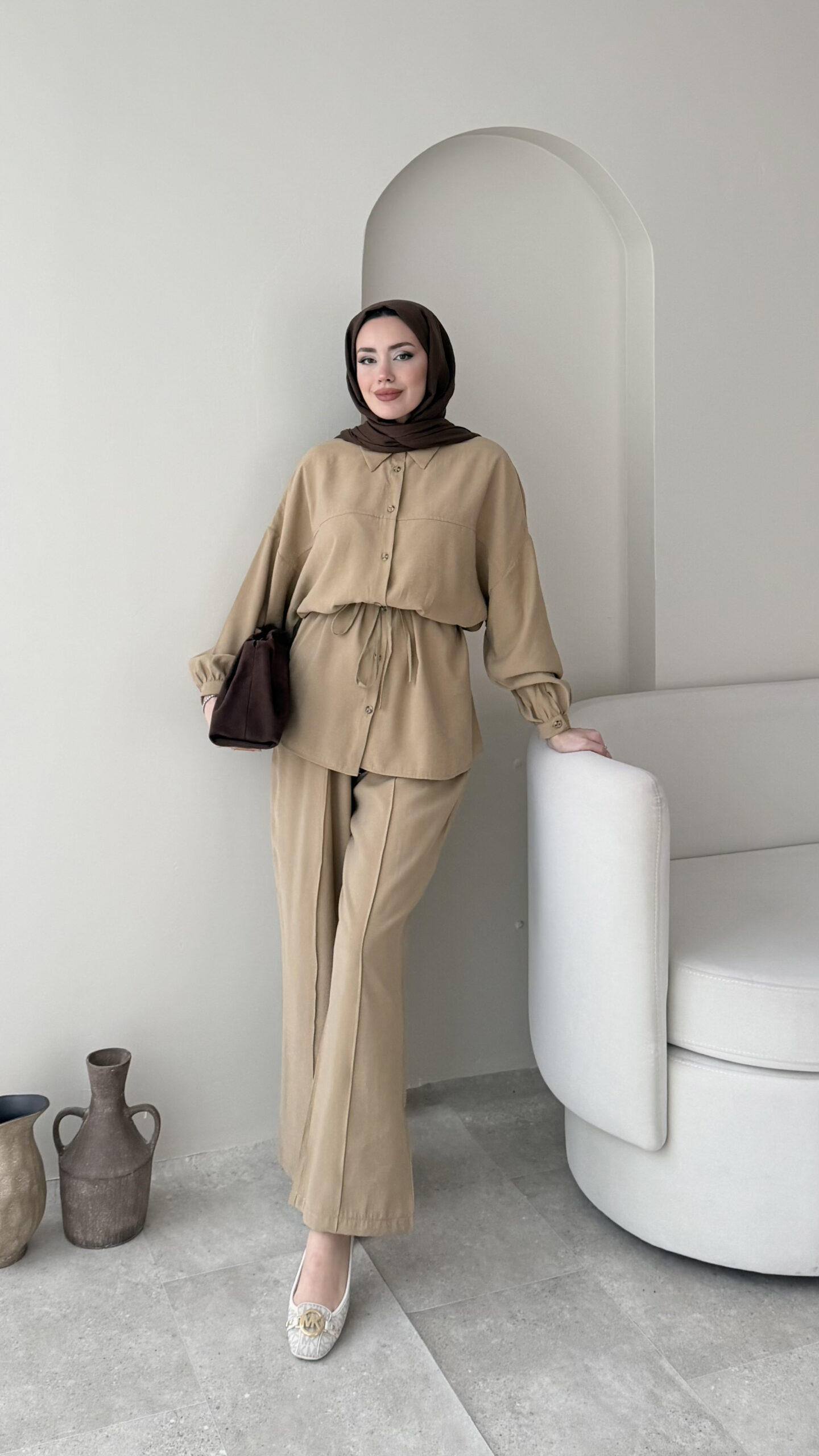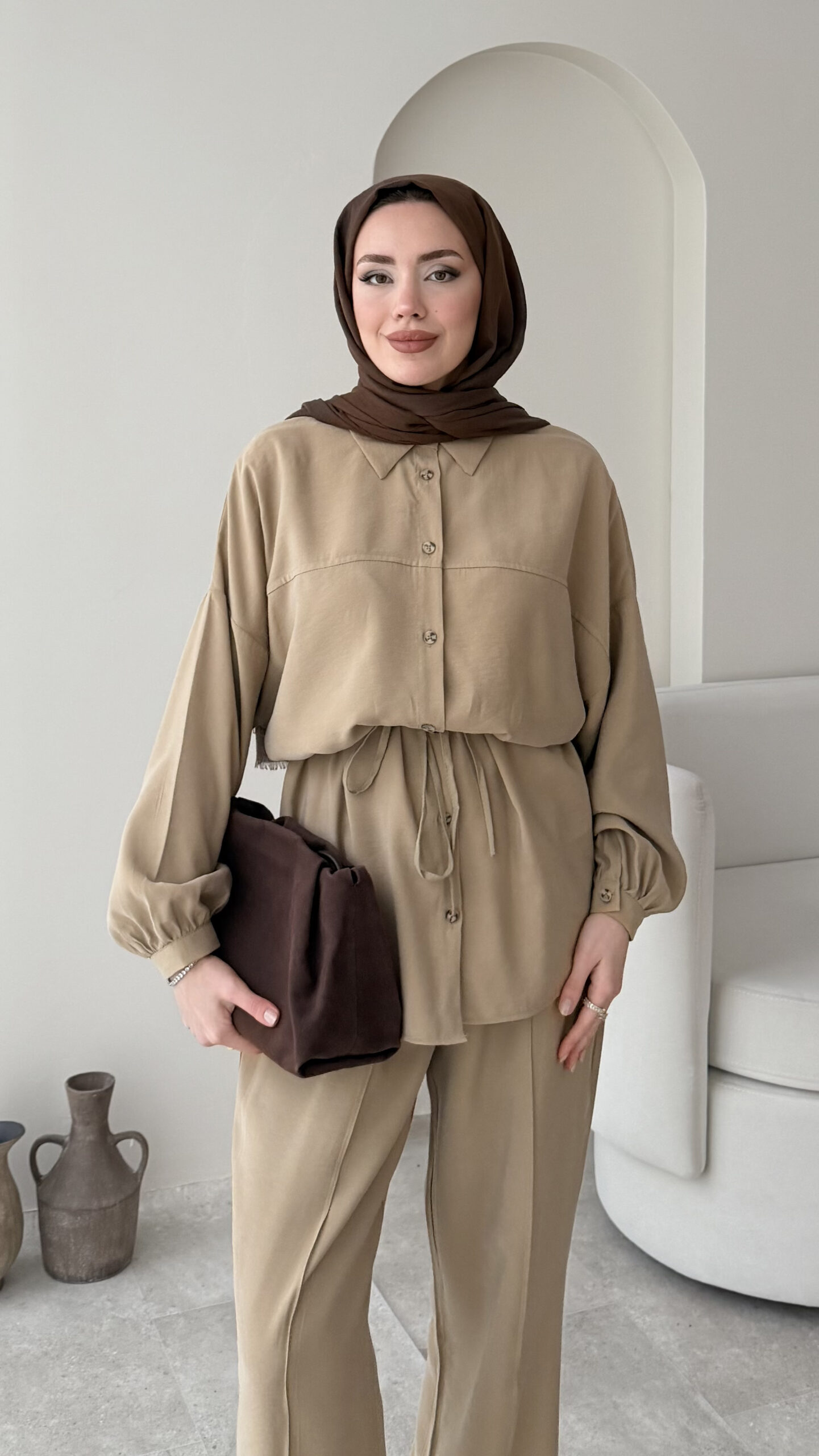 Pantalon beli lastikli, üst tunik rahat kalıptır.