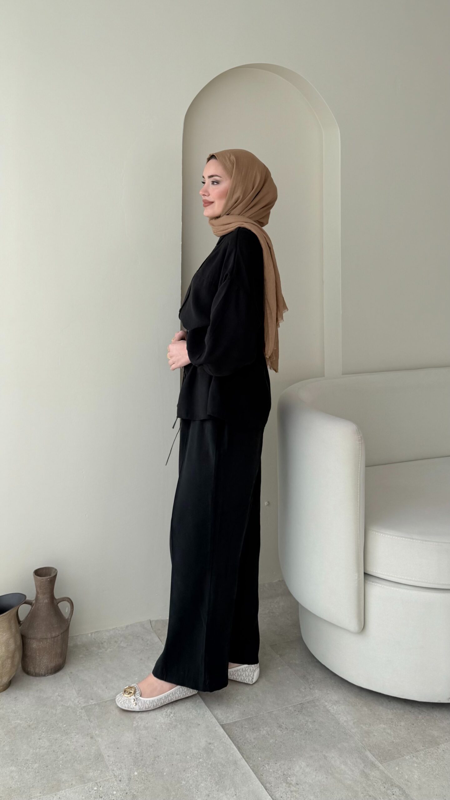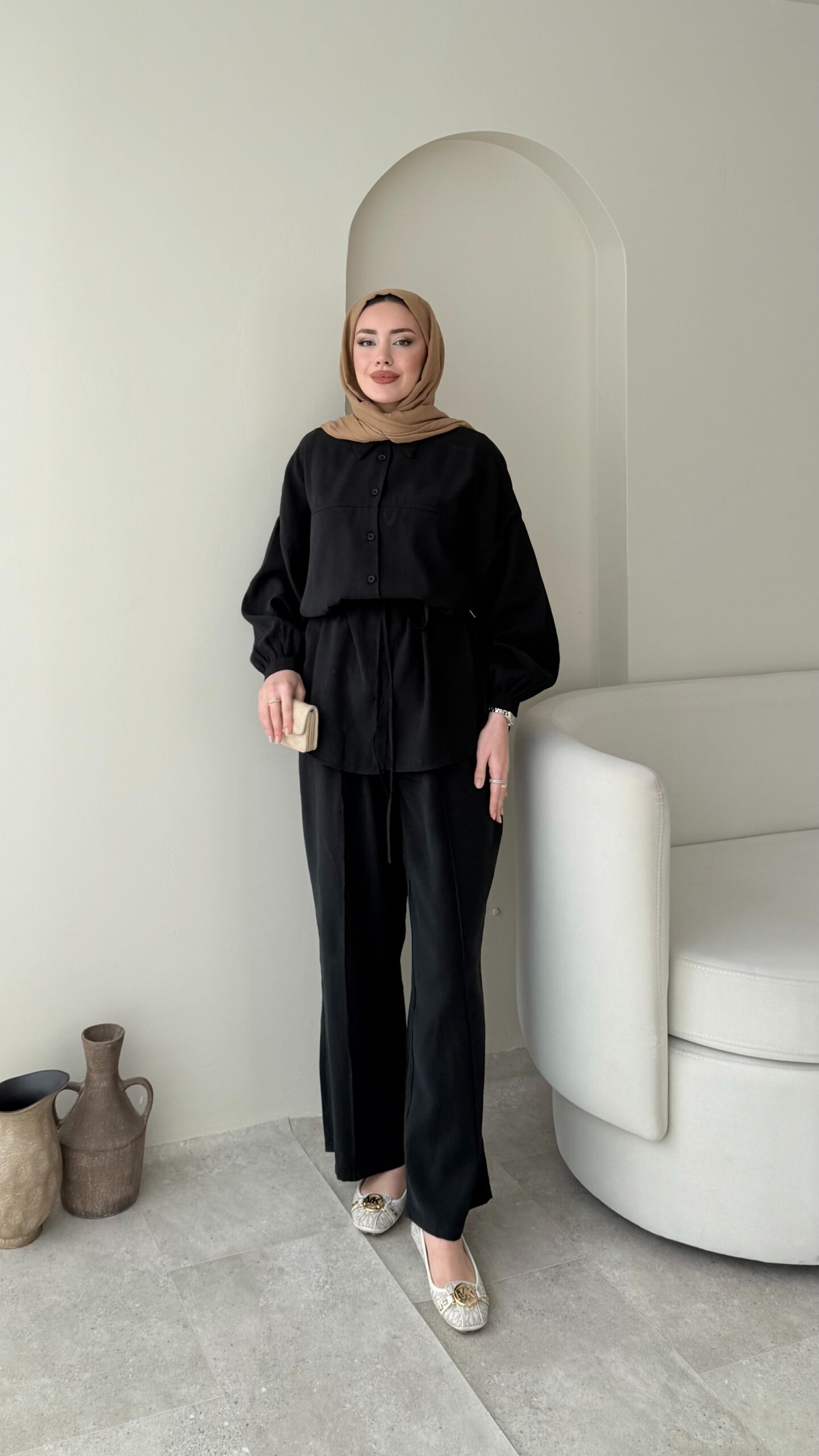 Pantalon beli lastikli, üst tunik rahat kalıptır.