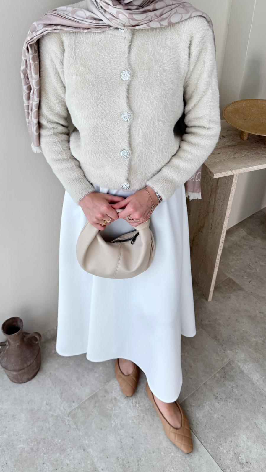 Premium kalite angora kumaş hırkamız,etek ve pantolonla kombinleyeceğiniz yumuşacık bir öneri.