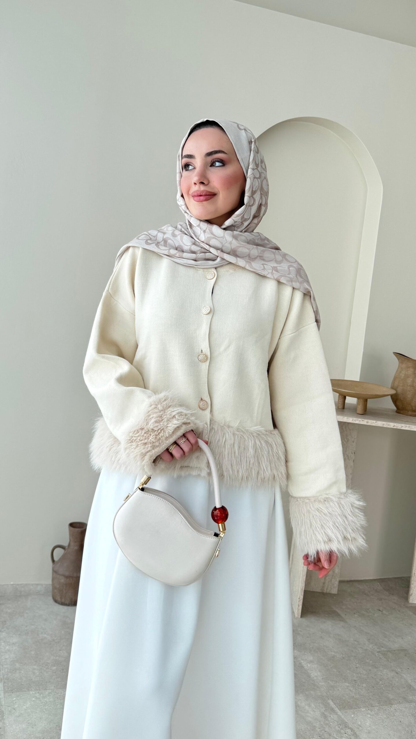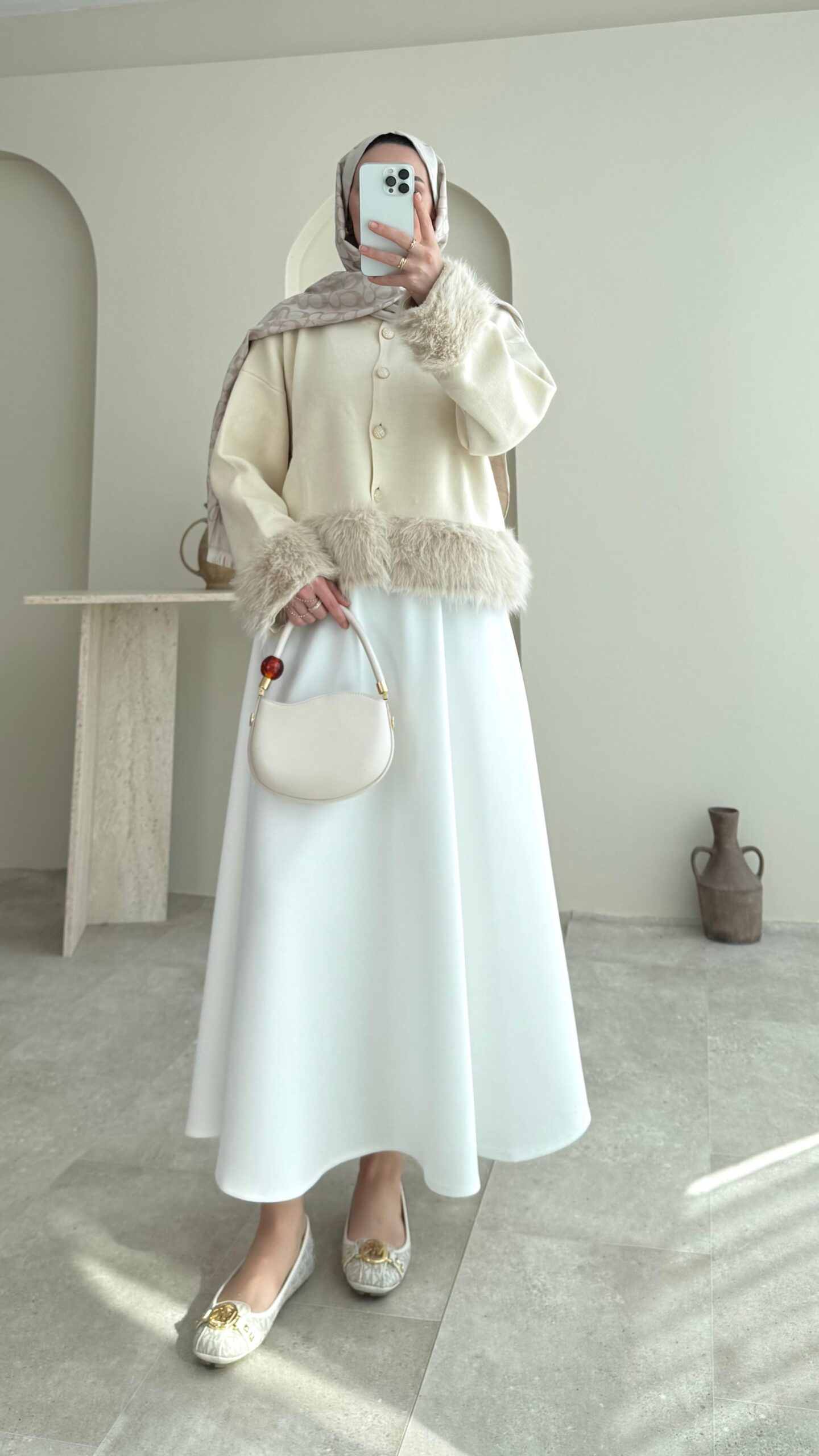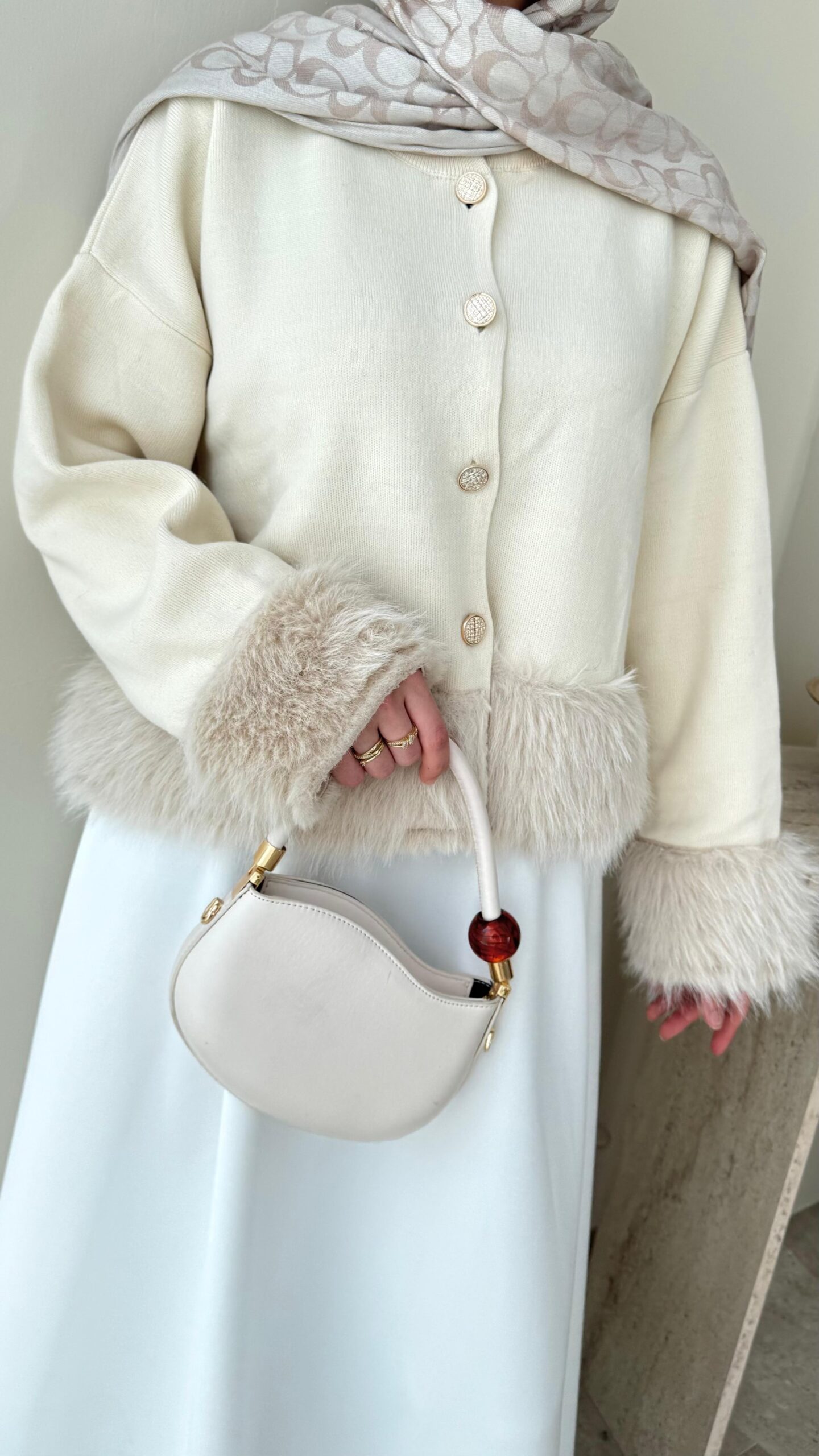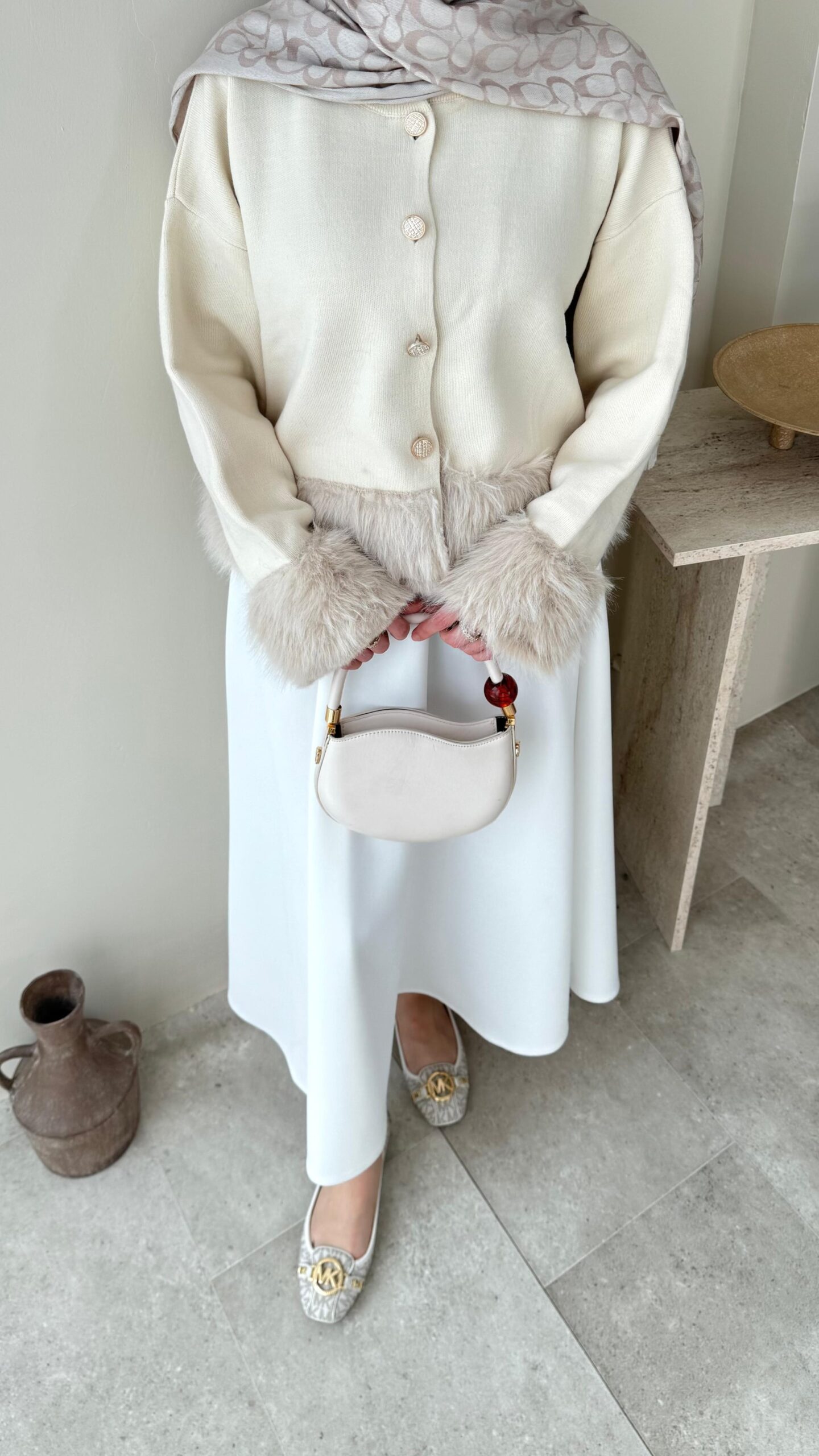 Merserize kumaş üzerine kürk detaylı hırkamız klasik,şık kombinleriniz için özel parçamız.