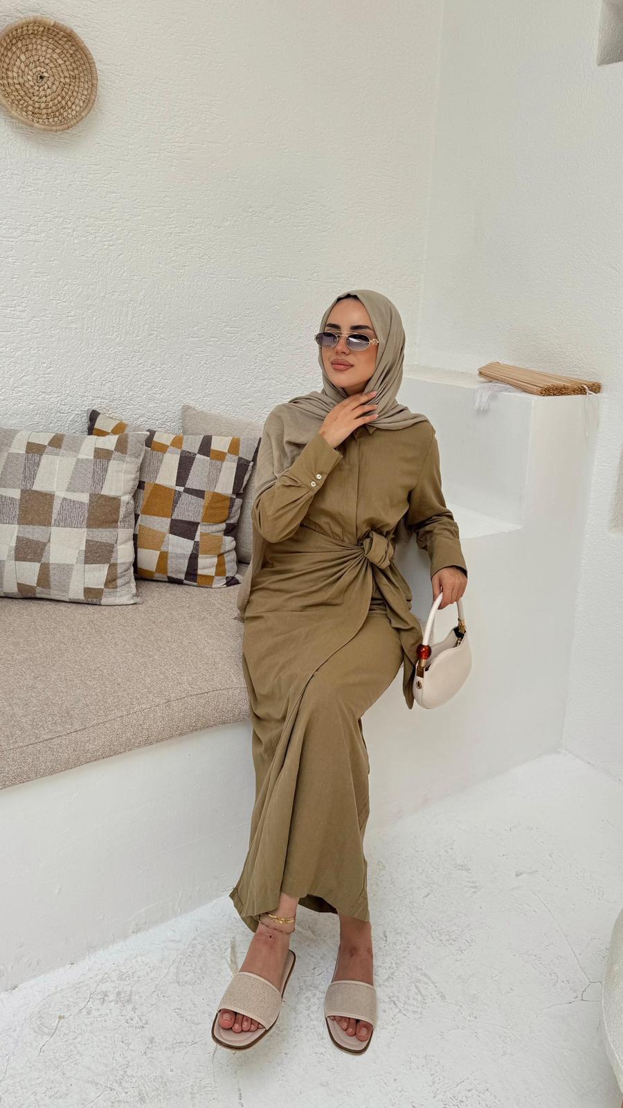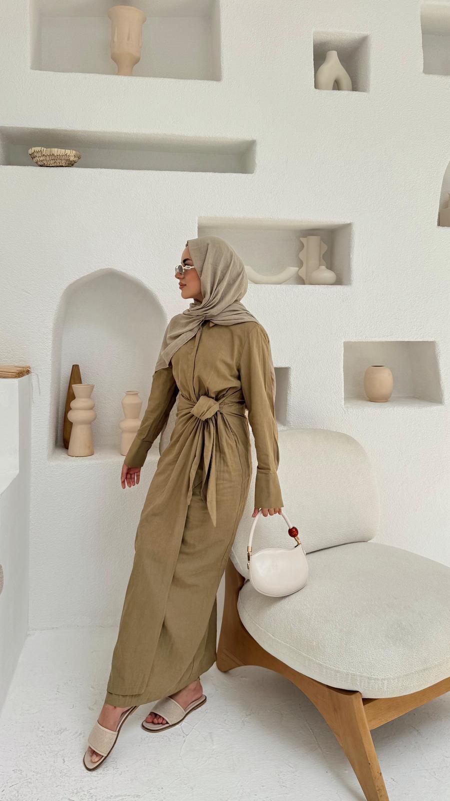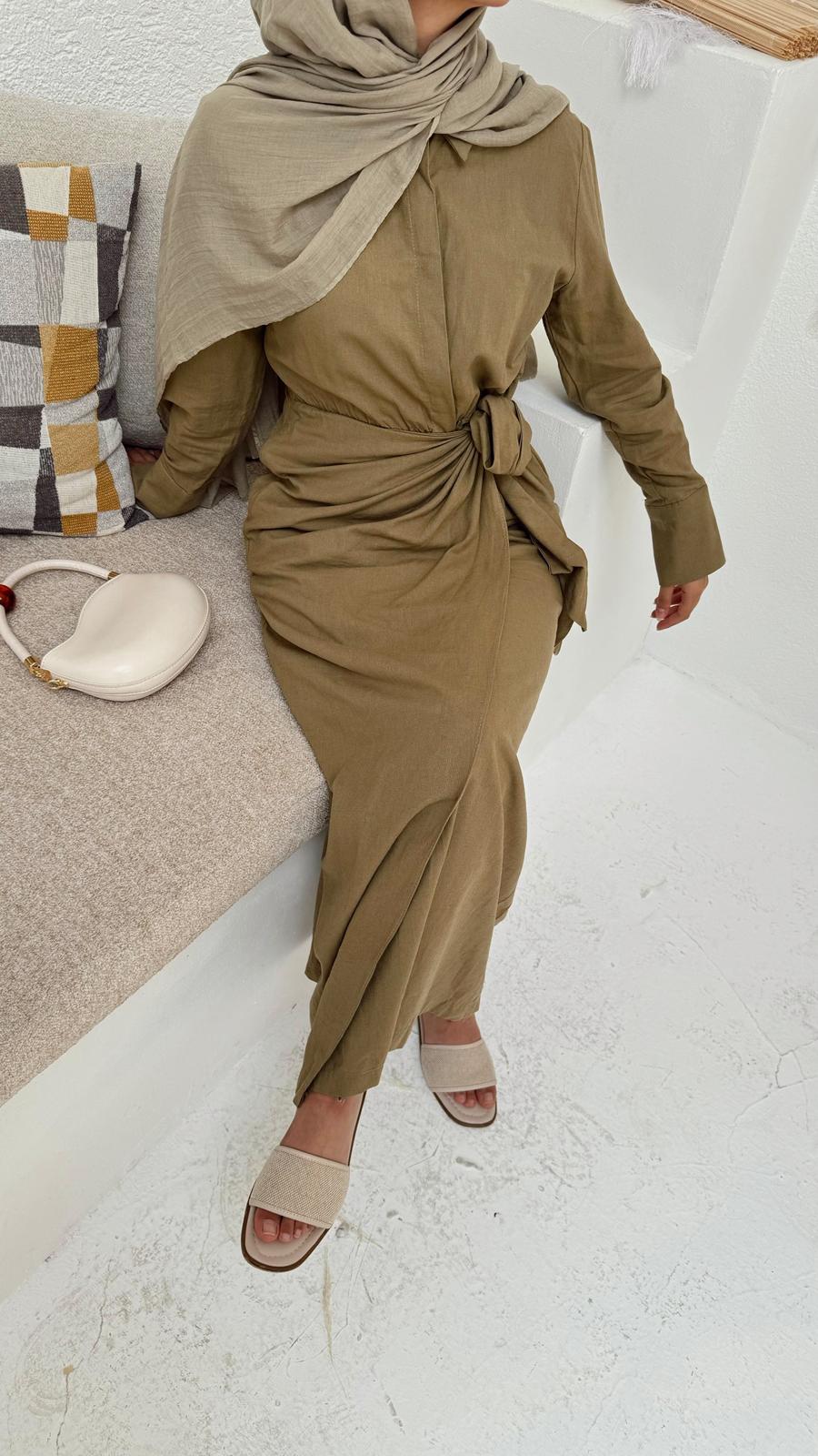 Bağlama Detaylı Keten Elbise – Yağ Yeşili