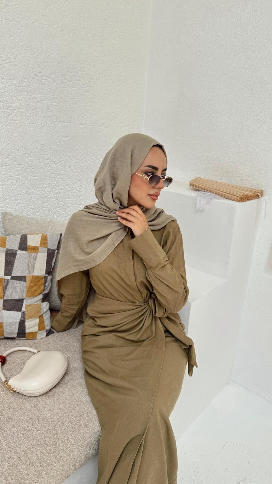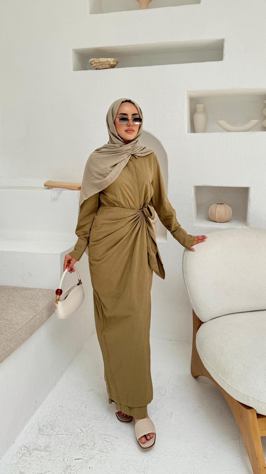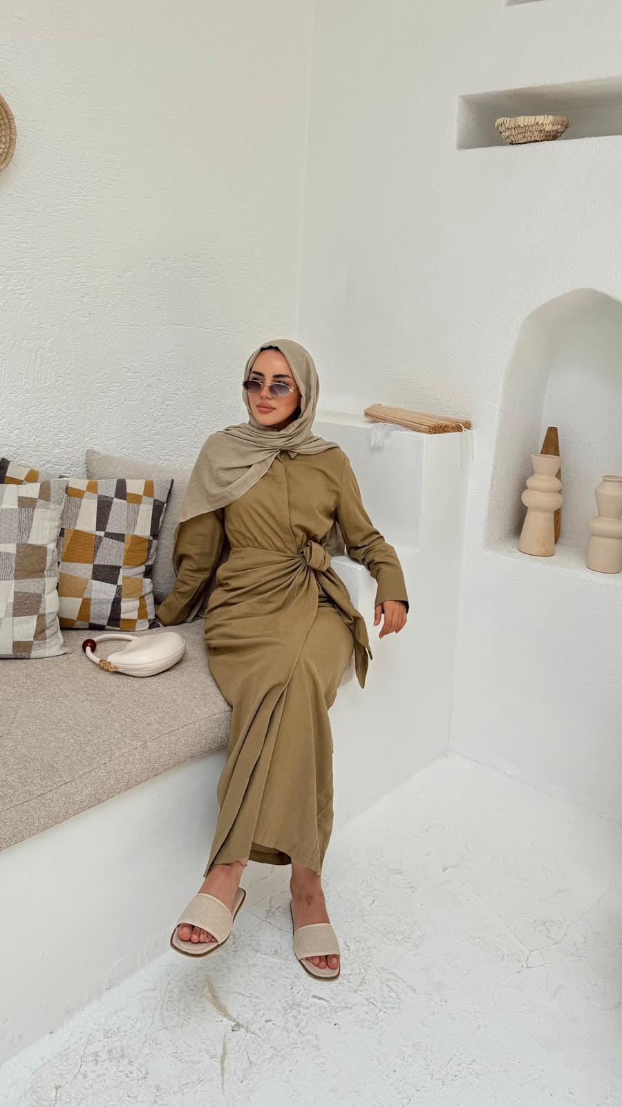 Bağlama Detaylı Keten Elbise – Yağ Yeşili
