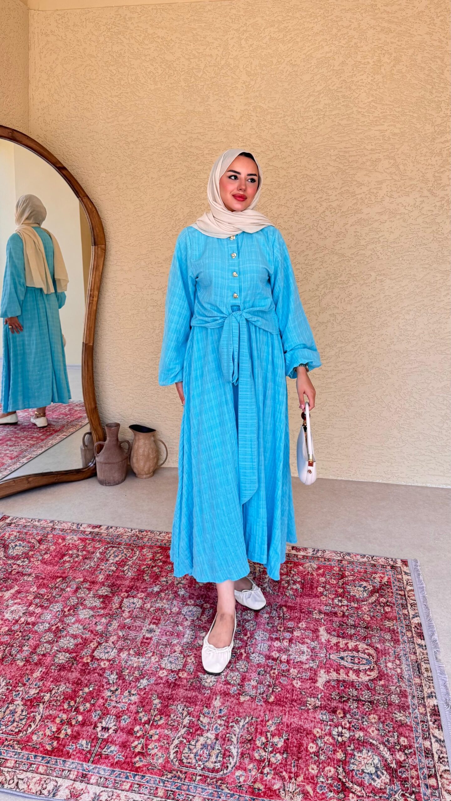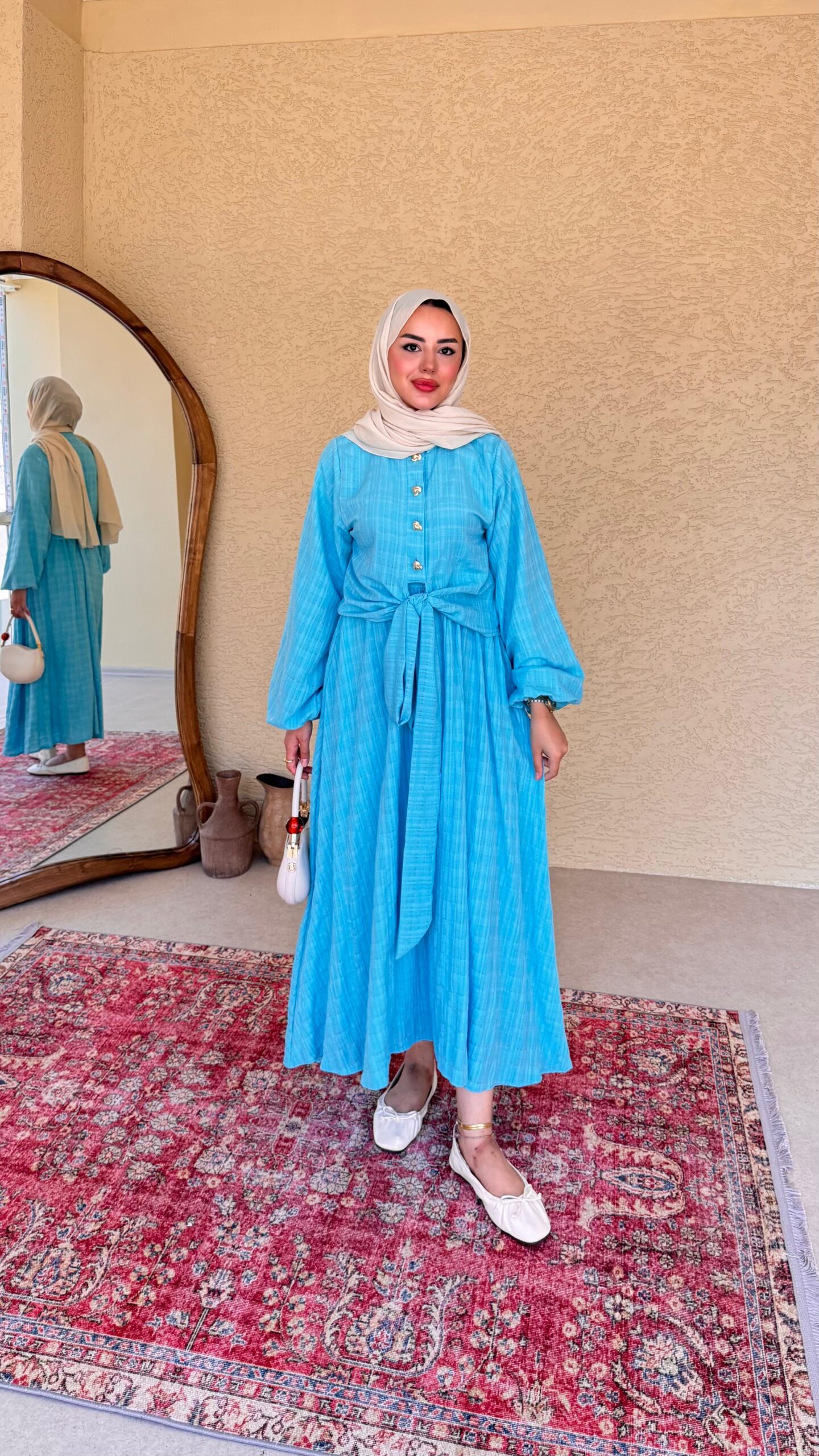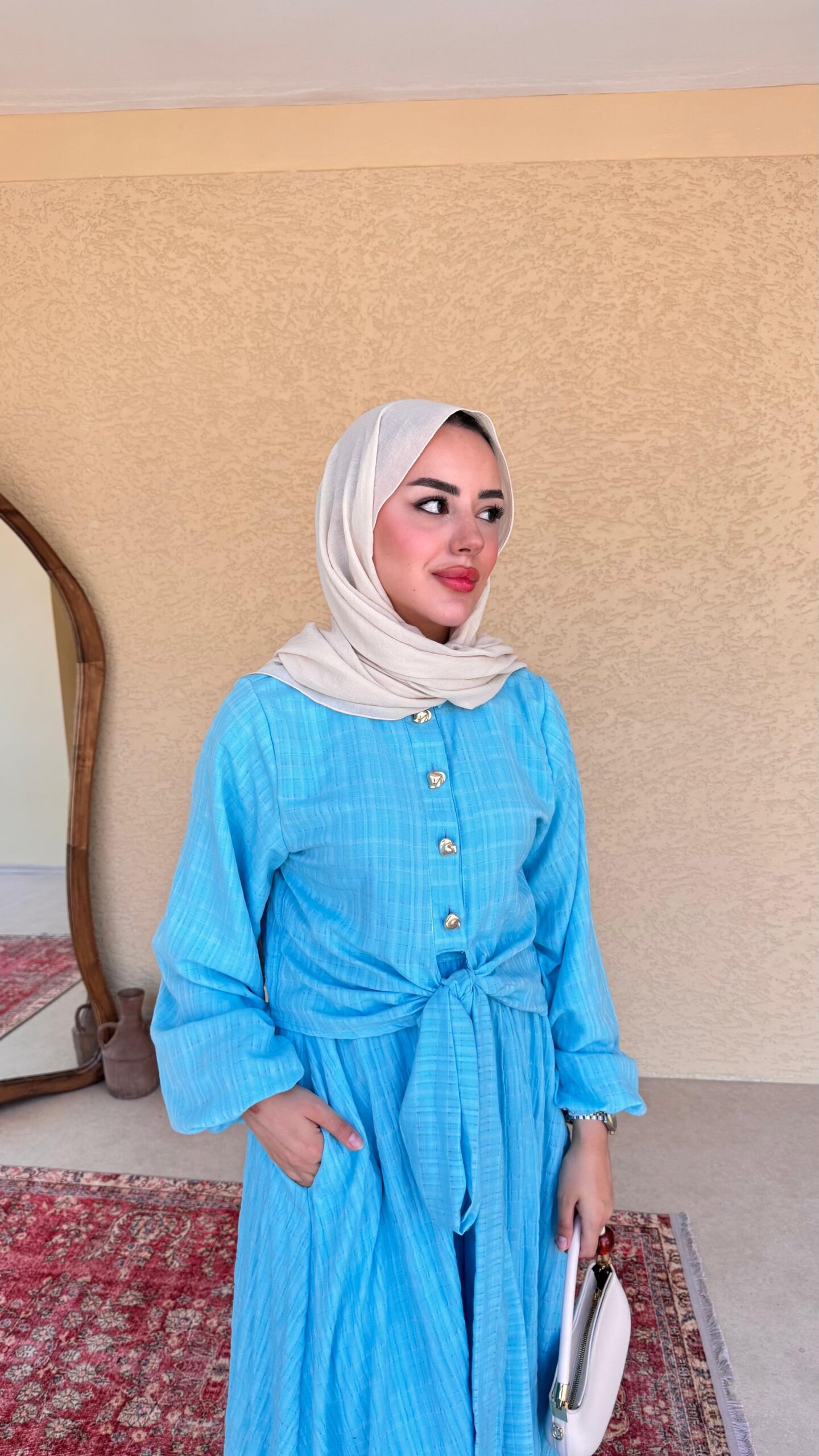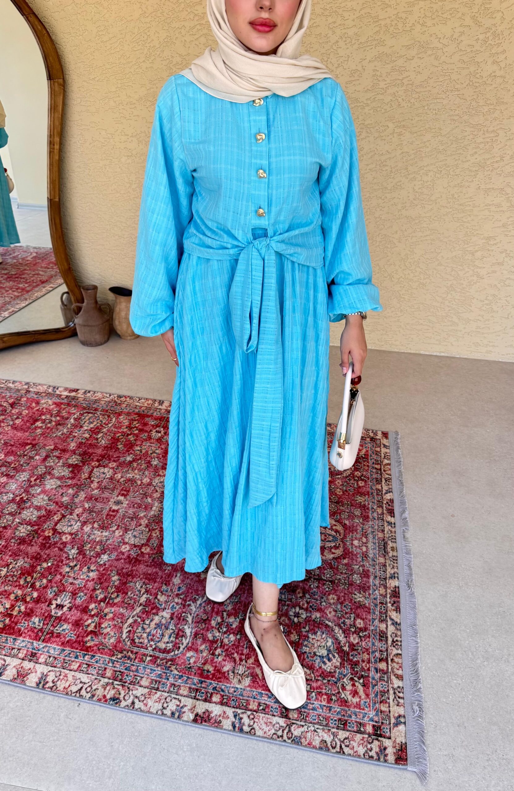 Gold düğme detayı, rahat ve sizi yormacak kumaşıyla tam bir prenses takımı.