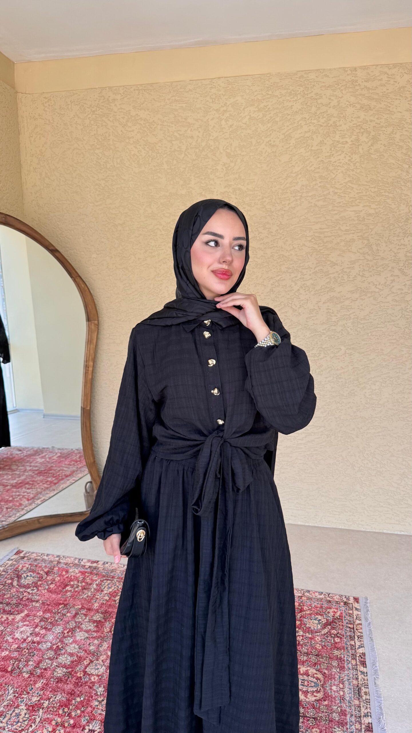 Gold düğme detayı, rahat ve sizi yormacak kumaşıyla tam bir prenses takımı.
