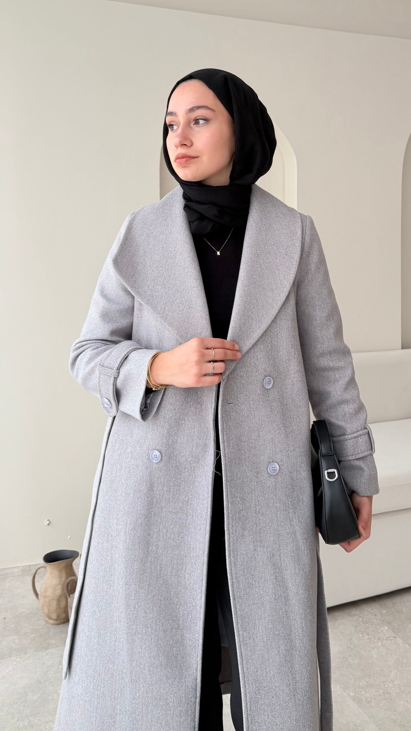 Hira Şal Yaka Premium Kaşe Kaban – Gri