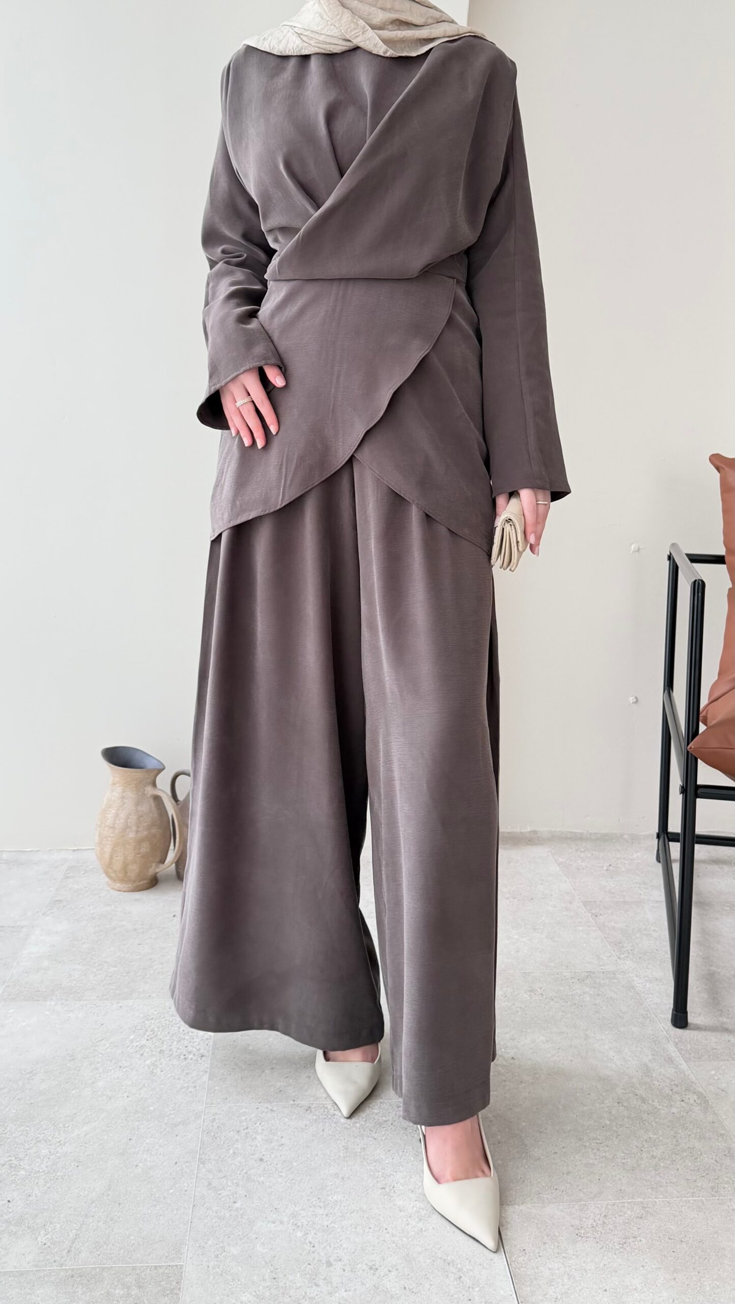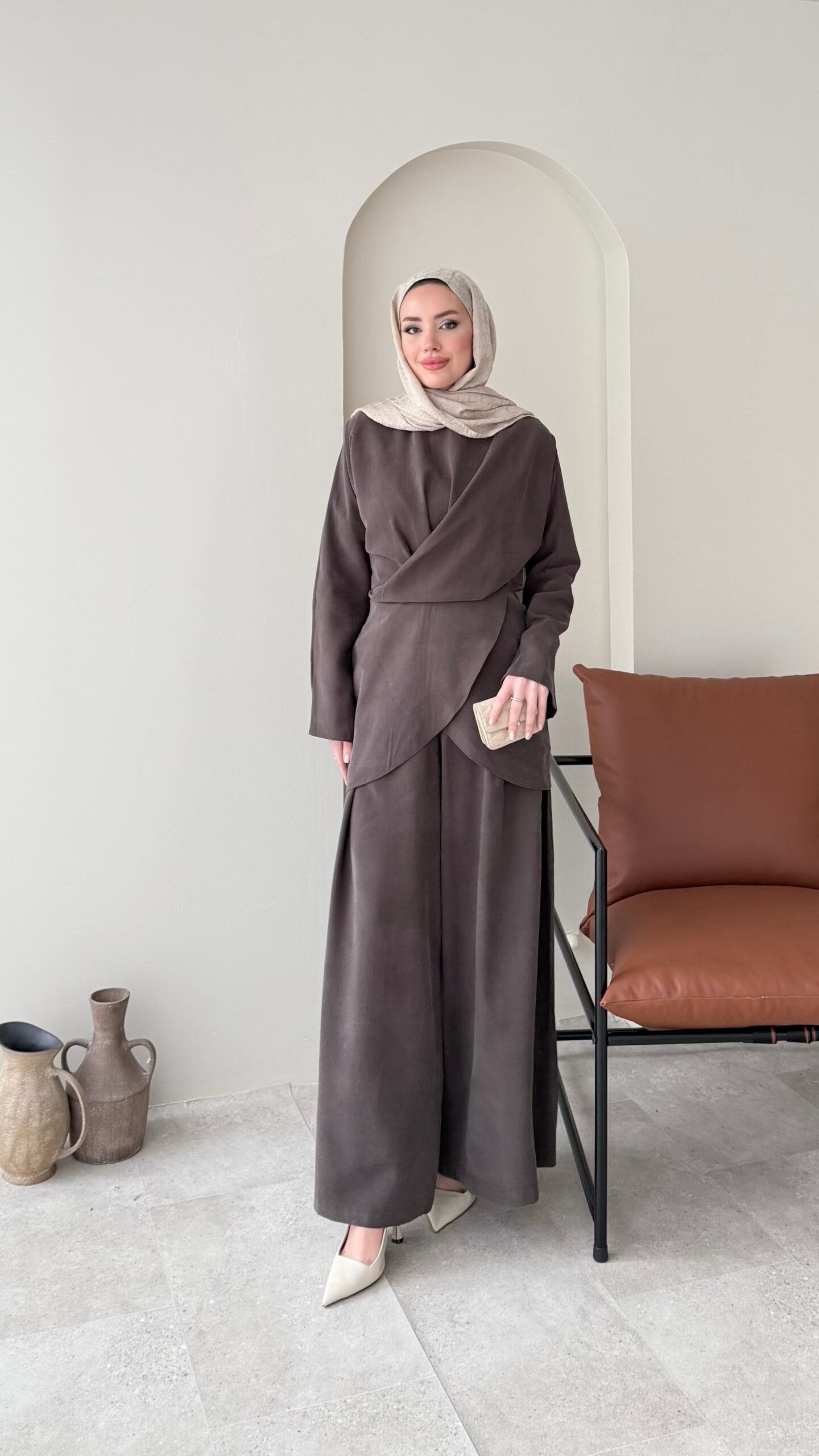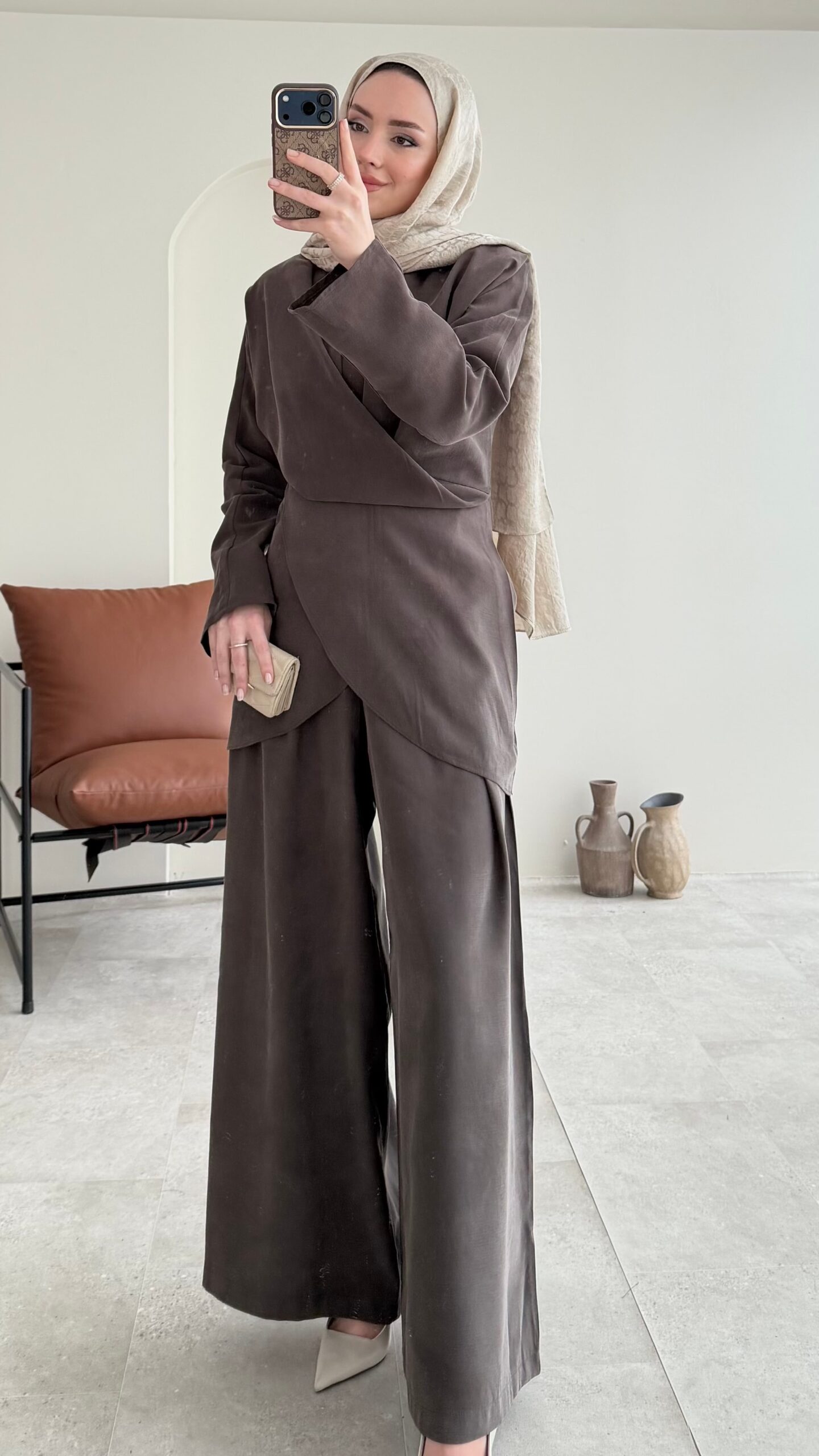 Özel ipek Qupra takımımız, belden oturtmalı bluzu ve yarı lastik yarı fermuarlı bol kesim pantalonuyla özel tasarım takımlarımız arasında✨