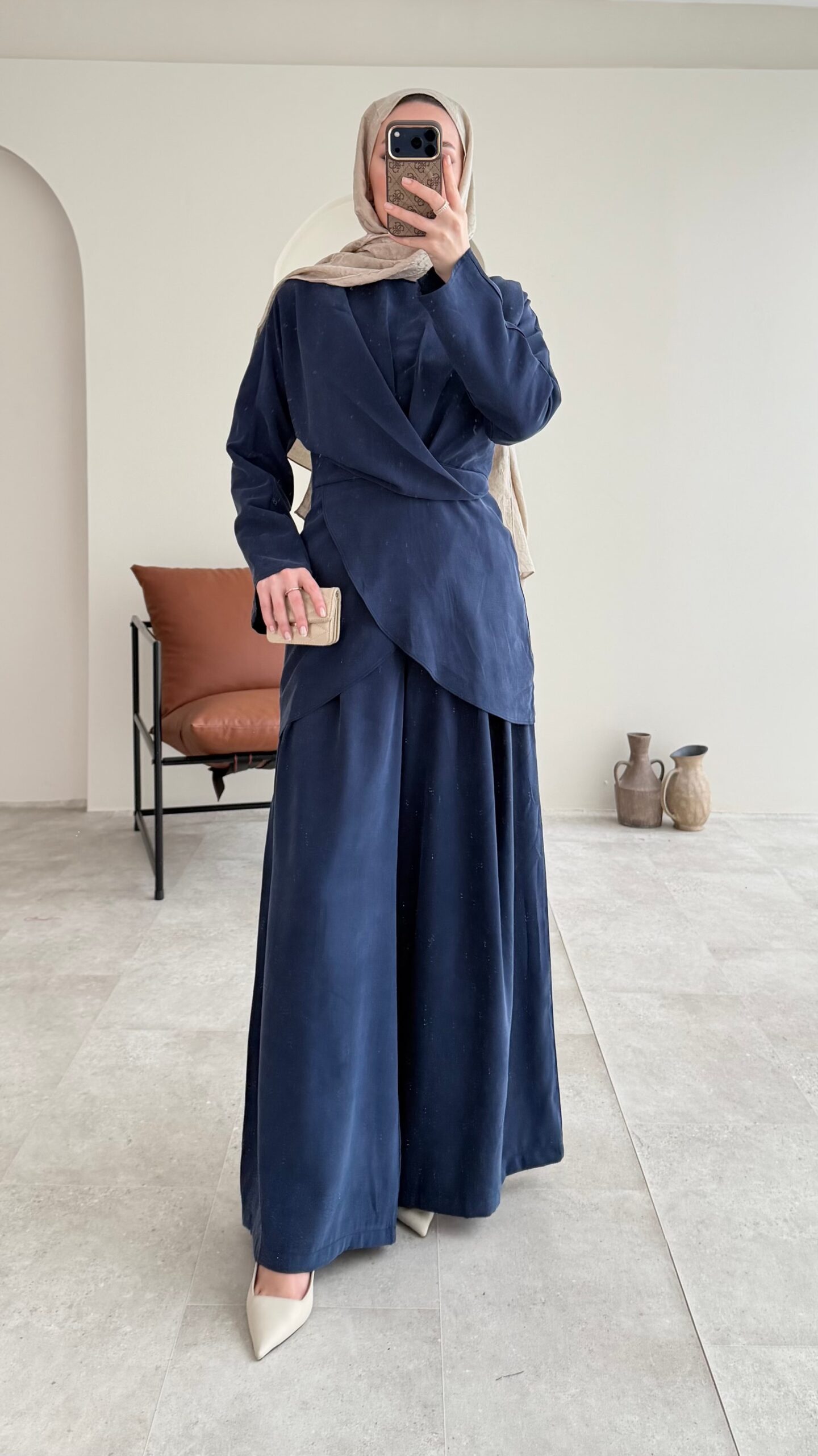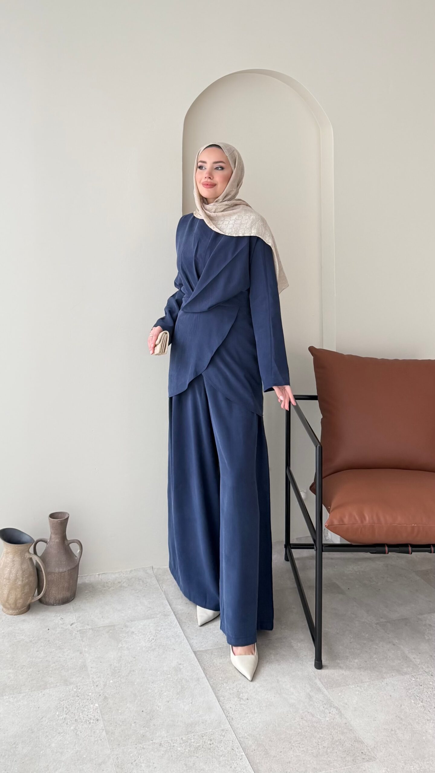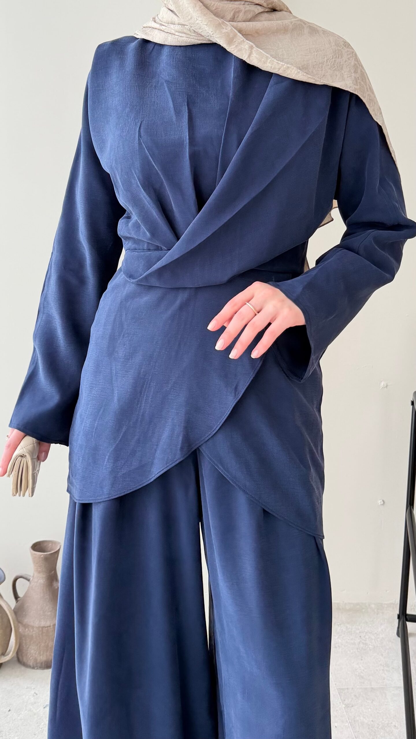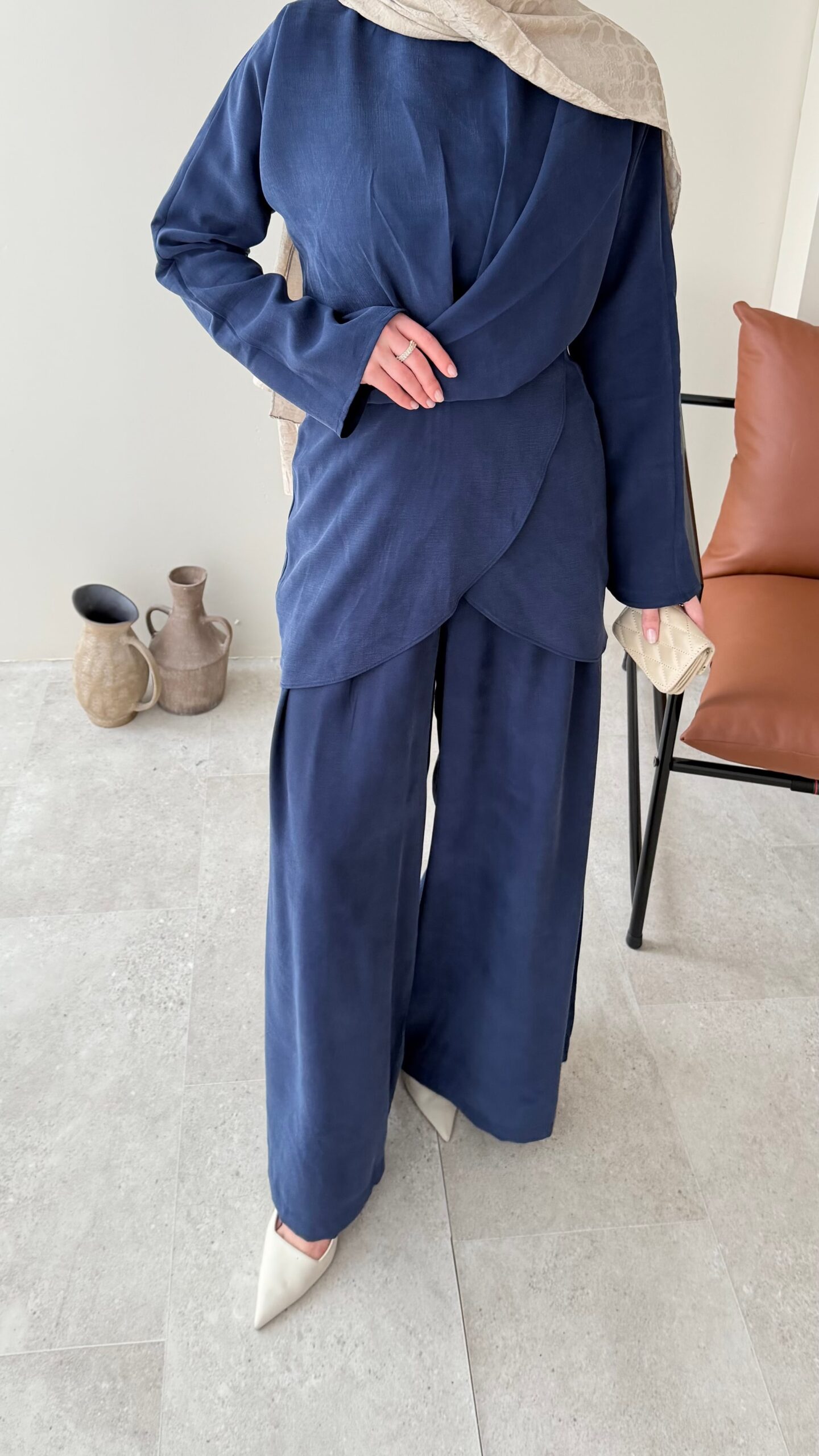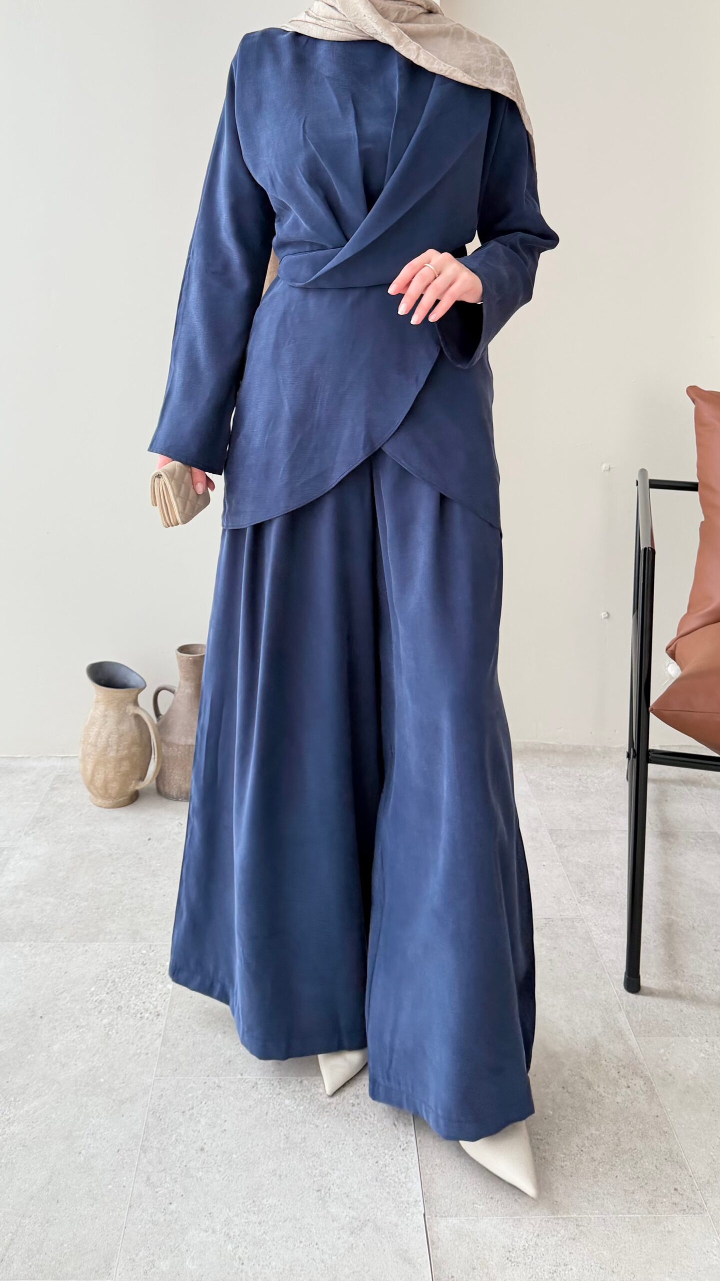 Özel ipek Qupra takımımız, belden oturtmalı bluzu ve yarı lastik yarı fermuarlı bol kesim pantalonuyla özel tasarım takımlarımız arasında✨