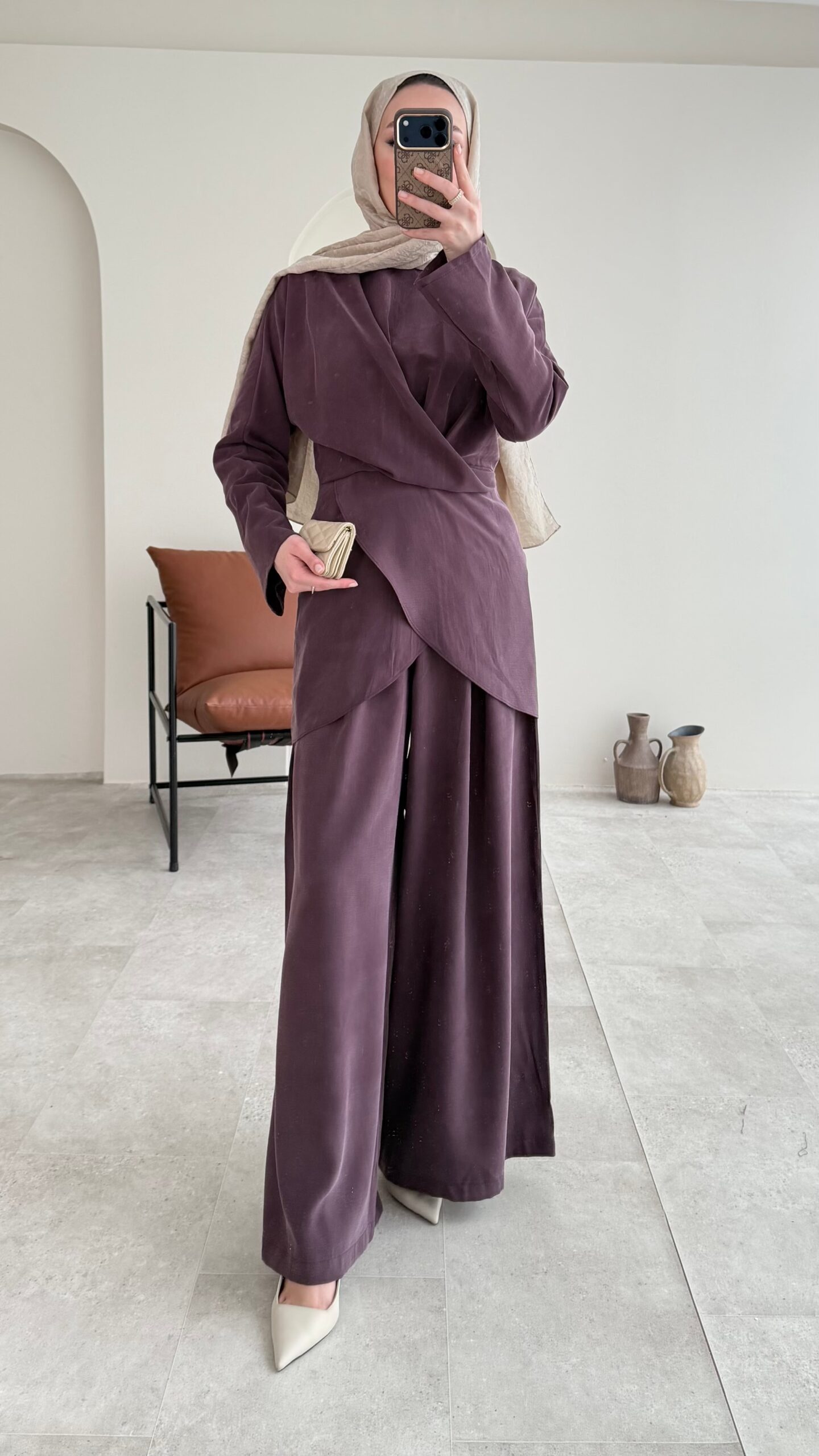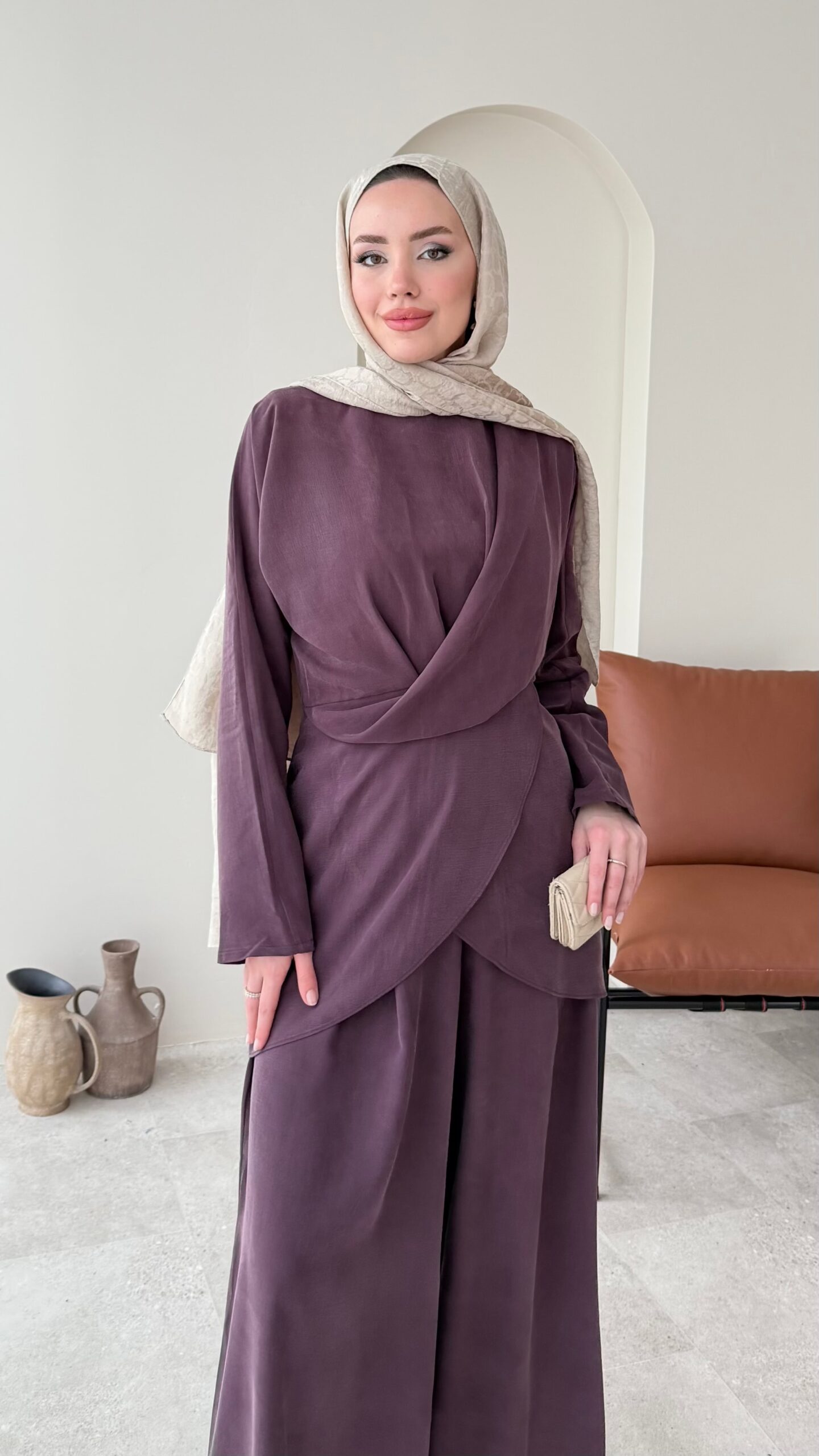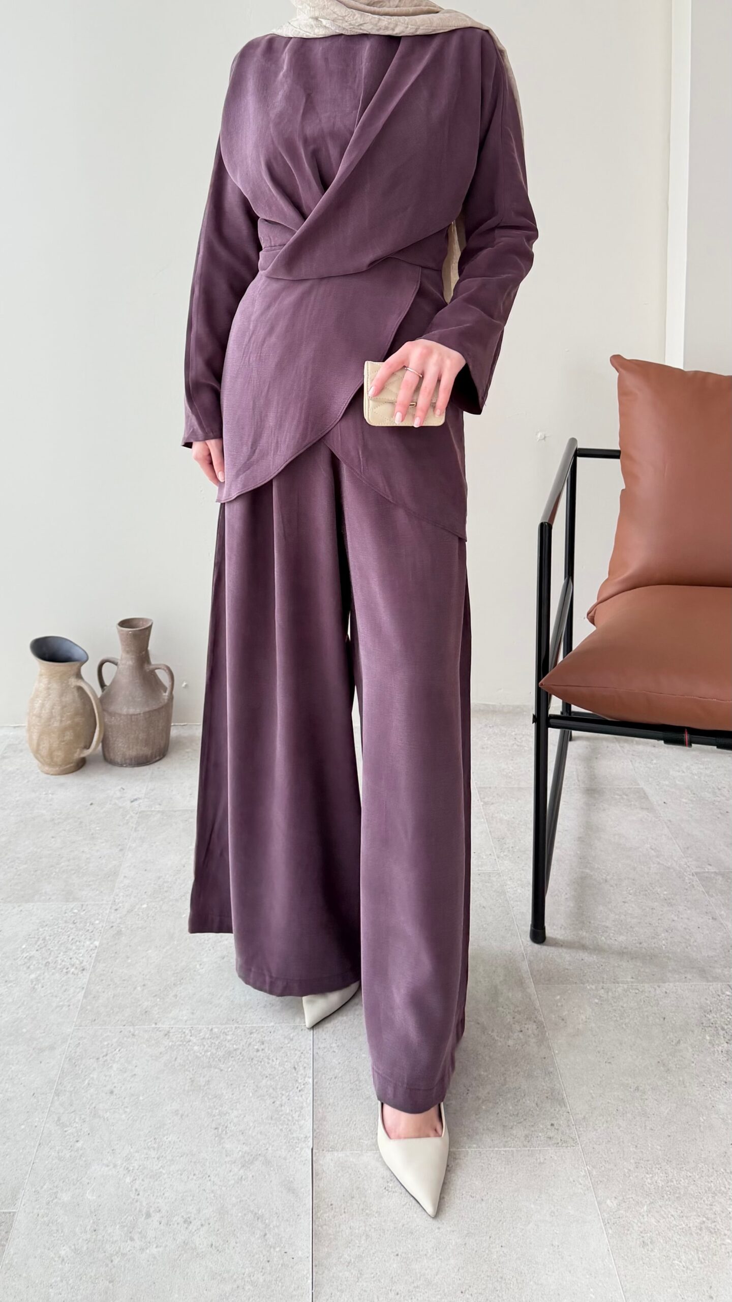 Özel ipek Qupra takımımız, belden oturtmalı bluzu ve yarı lastik yarı fermuarlı bol kesim pantalonuyla özel tasarım takımlarımız arasında✨