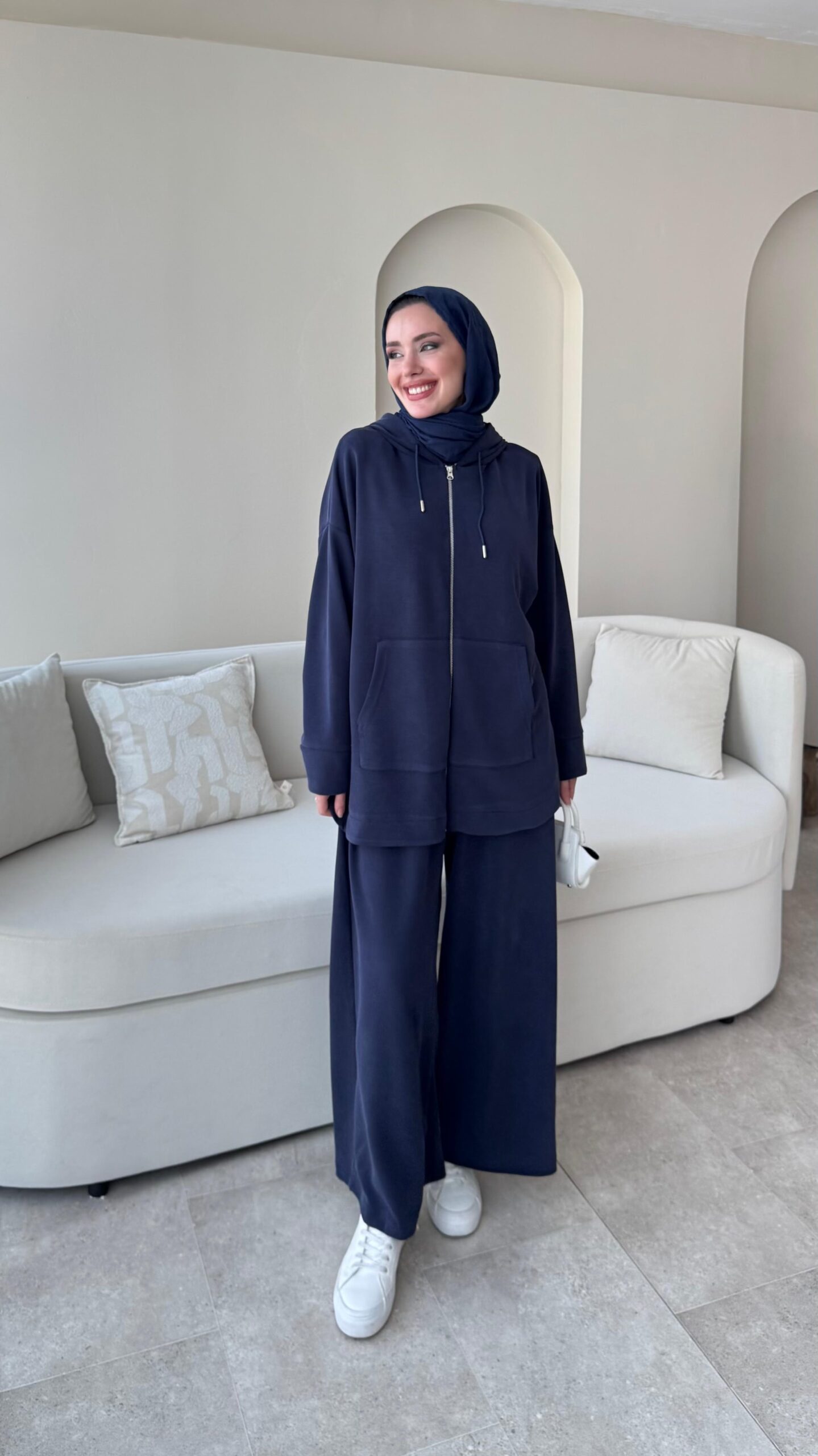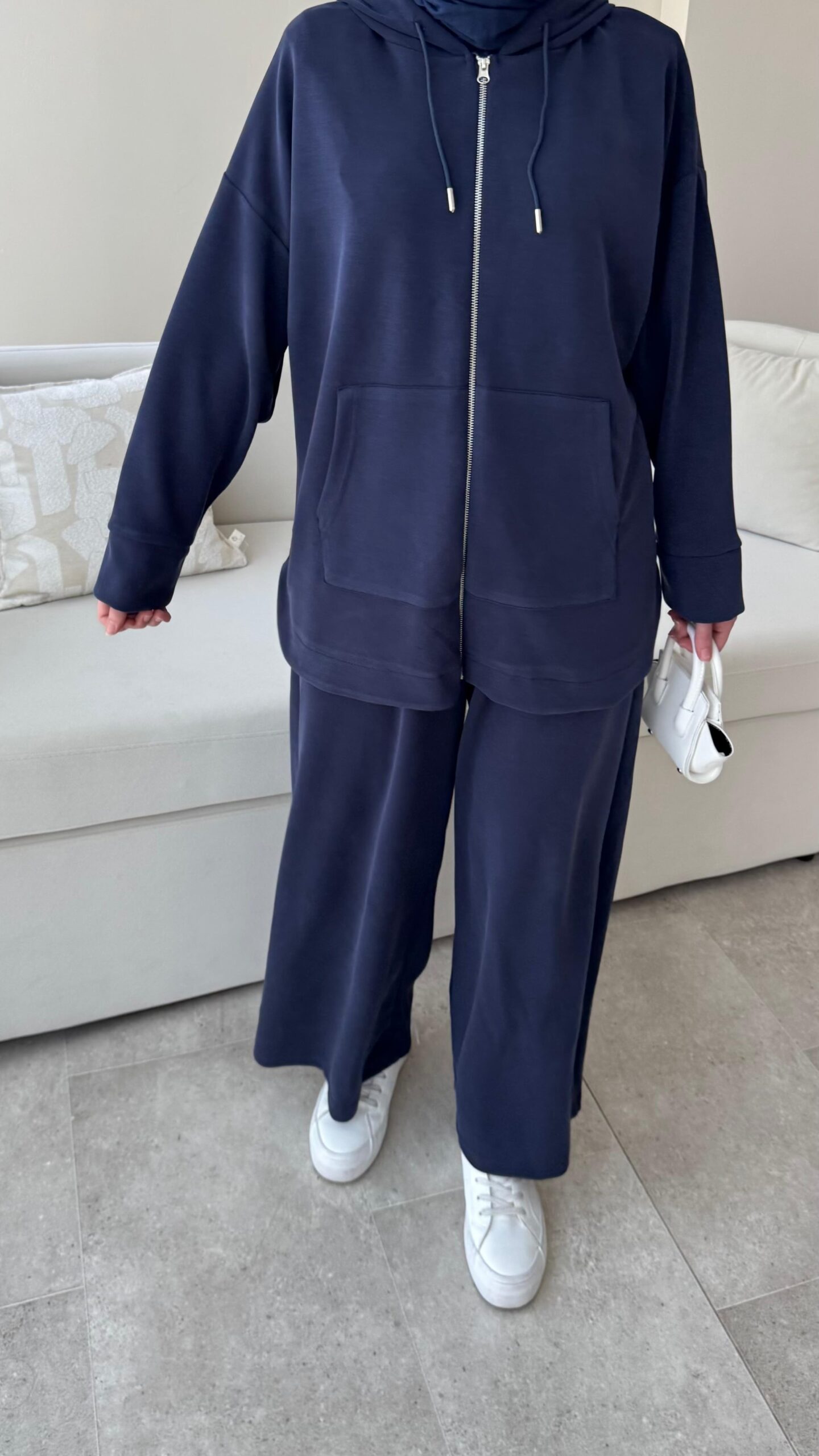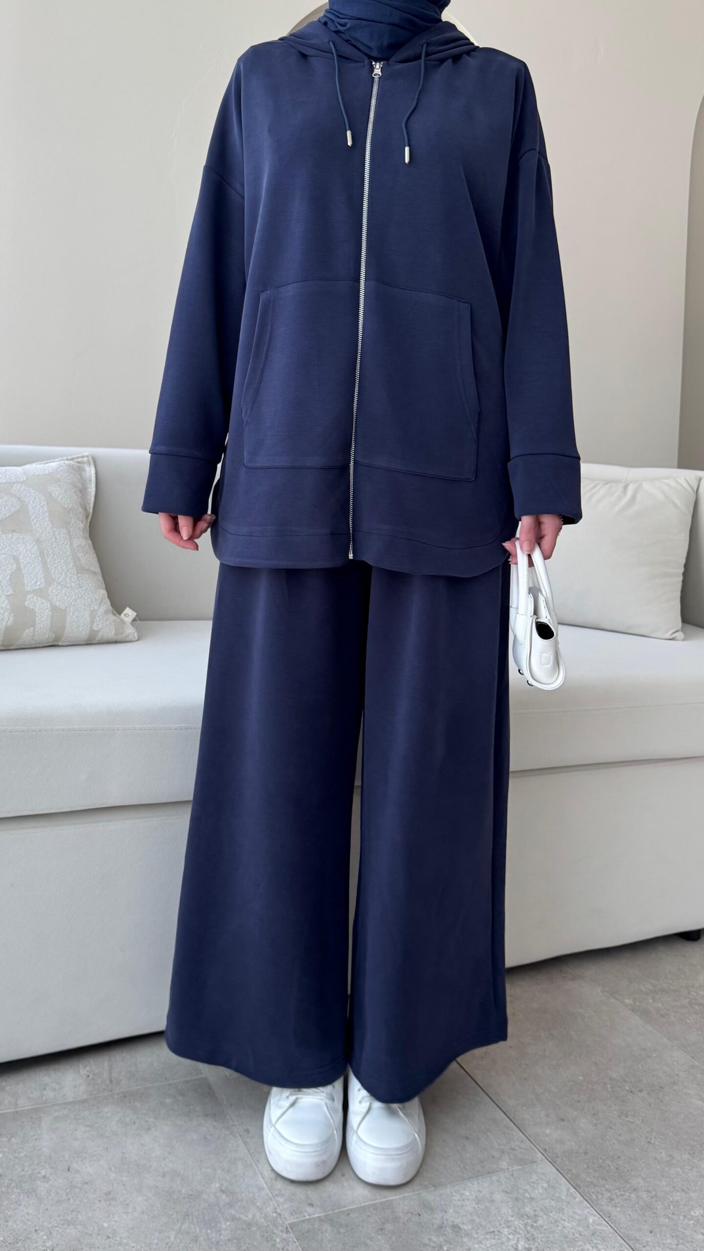 Bol paça pantolonu ve fermuarlı üst hırkasıyla değerlendirme takımlarımızdan.İster ayrı ayrı ister takım halinde kombinlenebilir,premium kalite oyşo kumaştan üretilen takımlarımızdan.